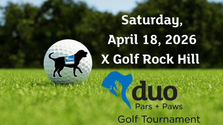 Join us for the Pars + Paws Golf Tournament on Saturday, April 18, 2026, at X-Golf Rock Hill! Grab your friends, hit the (indoor) greens, and tee up to support Duo Dogs. Enjoy a day of fun, friendly competition, and furry inspiration—all to help Duo continue building extraordinary bonds between people and dogs that change lives.